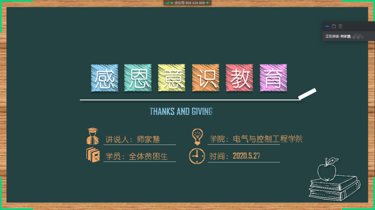为教育员工懂得感恩,学会感恩,存感恩之情,怀感恩之心,公司于5月27日-6月1日面向建档家庭困难同学和2020届全体毕业生分别开展了感恩主题教育活动,活动由辅导员师家慧老师主持。