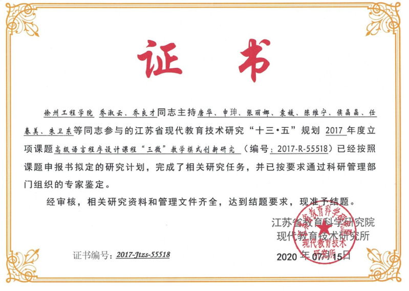 江苏省教育科学研究院现代教育技术研究所组织全省现代教育技术研究课题结题及评审工作,公司教师乔淑云主持的江苏省现代教育技术研究“十三·五”规划课题:高级语言程序设计课程“三微”教学模式创新研究 (课题编号:2017-R-55518),经专家组评审,顺利结题。这是伟德国际bevictor1946新成立来获批的第一个市厅级教研课题结题项目。