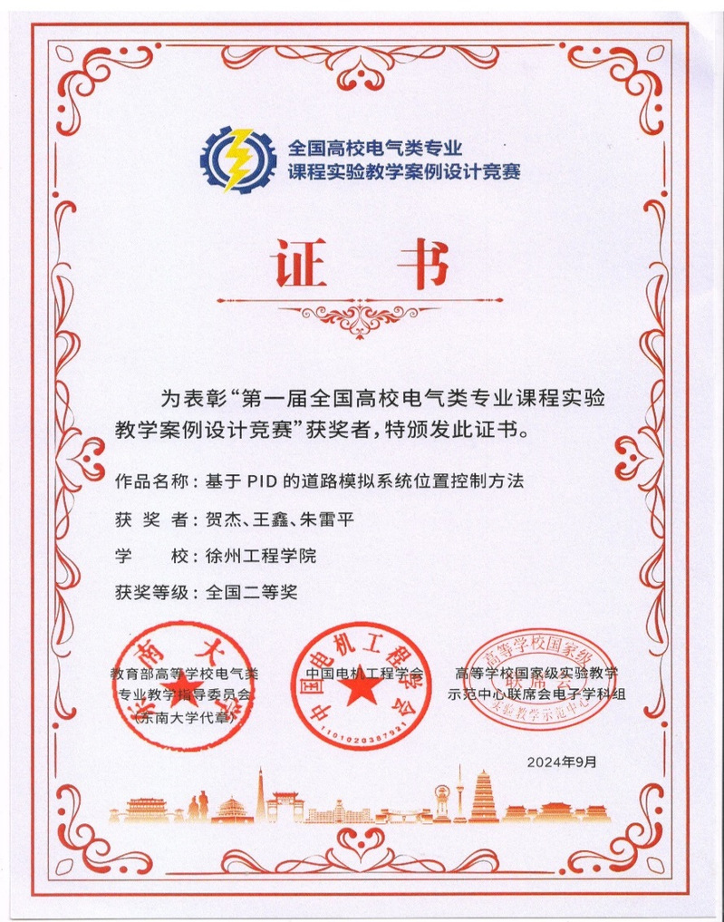 2024年9月28日-29日,由教育部电气类教学指导委员会、中国电机工程学会和国家级实验教学示范中心联席会电子学科组共同主办,西安交通大学承办,中国电源学会、南瑞集团有限公司协办的第一届全国高校电气类专业课程实验教学案例设计竞赛在陕西西安中国西部科技创新港成功举办。我院贺杰、王鑫、朱雷平三人团队的“基于PID的道路模拟系统位置控制方法”项目获得二等奖。