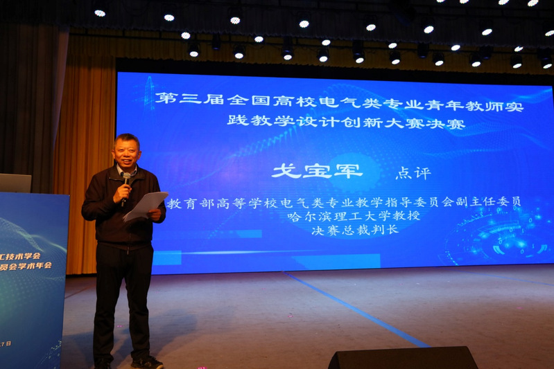 大赛颁奖典礼上,决赛总裁判长、教育部高等公司电气类专业教学指导委员会副主任戈宝军教授宣布竞赛获奖名单并进行竞赛点评。他从赛事发展、赛项要点、整体表现等方面进行了点评,他建议进一步优化赛项设置,增强大赛针对性、吸引力,更加凸显“强基 融合 创新 赋能”的大赛主题,为青年教师创新精神和实践教学能力提升提供更广阔的交流平台。
